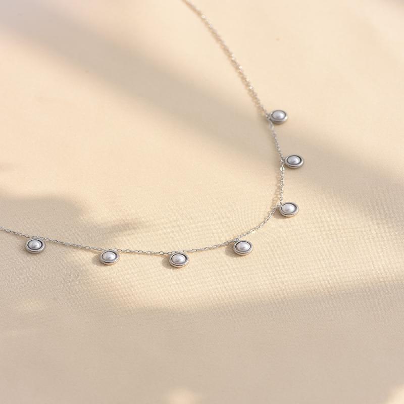 A delicate silver necklace adorned with evenly spaced pearl-like charms, offering a touch of elegance and simplicity. Perfect for layering or wearing on its own for a refined look.